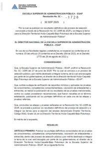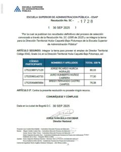 La Escuela Superior de Administración Pública (ESAP) publicó, mediante la Resolución No. SC-1728 del 30 de septiembre de 2025, los resultados definitivos del proceso de selección para elegir al próximo director territorial de Huila, Caquetá y Bajo Putumayo.