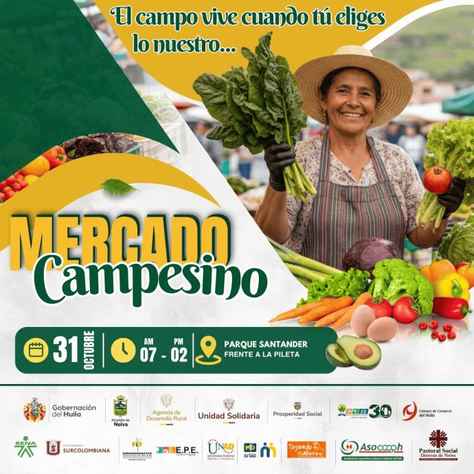 El Mercado Campesino hace parte de la estrategia departamental “Por un Huila Grande” y cuenta con el respaldo de instituciones como la Agencia de Desarrollo Rural (ADR), la Universidad Surcolombiana, la UNAD, Uniminuto, Asocoop, la CAM, el SENA, la Alcaldía de Neiva, Pastoral Social, la Cámara de Comercio del Huila y Prosperidad Social, entre otras.