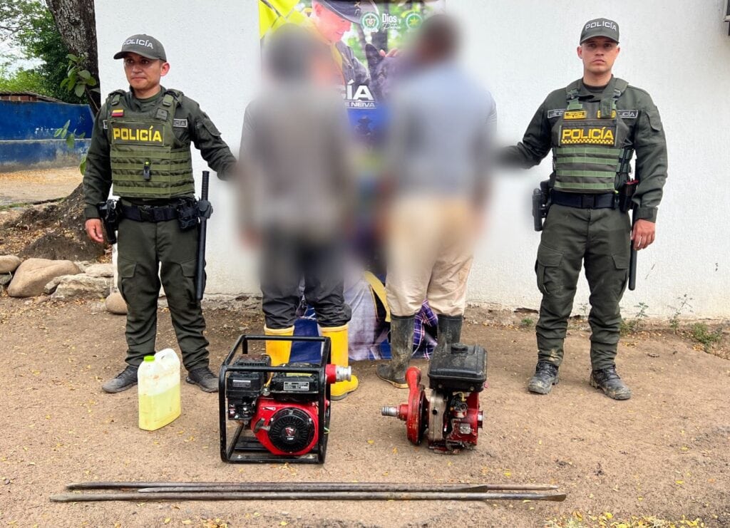 La intervención fue desarrollada por integrantes de la Seccional de Carabineros y Protección Ambiental (SECAR) del Departamento de Policía Huila, en el marco del Plan Integral Contra la Explotación Ilícita de Yacimientos Mineros. Durante los patrullajes de control ambiental realizados en la vereda Moscovia, los uniformados detectaron a dos hombres que utilizaban motobombas para extraer material sin contar con los permisos de la autoridad ambiental competente.