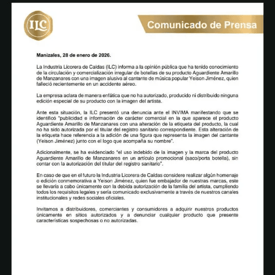 “La Industria Licorera de Caldas informa a la opinión pública que ha tenido conocimiento de la circulación y comercialización irregular de botellas de su producto Aguardiente Amarillo de Manzanares con una imagen alusiva al cantante Yeison Jiménez. La empresa aclara que no ha autorizado, producido ni distribuido ninguna edición especial de su producto con la imagen del artista”, indicó la compañía a través de un comunicado oficial.