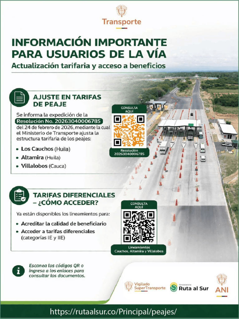 El Ministerio de Transporte oficializó nuevas tarifas para los peajes de Los Cauchos y Altamira, en el Huila, y Villalobos, en el Cauca, mediante la Resolución 20263040006785 del 24 de febrero de 2026.